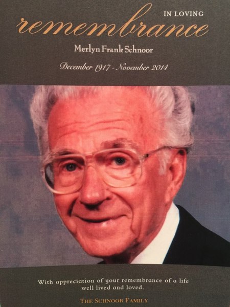 There will be a memorial service for Merlyn Schnoor on Sabbath, March 28, at 4 p.m., in the Riess Chapel at the Village Seventh-day Adventist Church in Berrien Springs, Michigan.