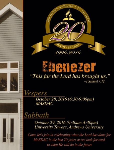 This far the Lod has brought us. Come celebrate with us what the Lord has done for us for the last 20 years; Friday, Oct 28 (6:30 - 9 pm) at MASDAC; Sabbath, October 29 (9:30 am - 4:30 pm) University Towers Auditorium, Andrews University.