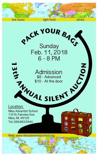 The 13th Annual Silent Auction will take place on Sunday, Feb. 11, from 6–8 p.m. at the Niles Adventist School (110 N Fairview, Niles, MI) . You are invited to come and enjoy appetizers and live music by Laura Whidden, while bidding on your favorite items from area businesses. Funds raised will be for technology at NAS. Go to www.NilesAdventistSchool.org (or call 269-683-5444) to reserve your ticket in advance.