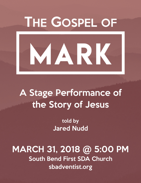 Experience the good news of Mark's gospel by attending this stage performance told by Jared Nudd. Pastor Nudd has committed to memory the entire gospel and will be sharing Mark's words as it was orginally intended—orally in its entirety. This event is free and open to the public on Saturday, March 31, 2018, at 5 p.m. at the South Bend First SDA Church. We hope you and your family will plan to attend!