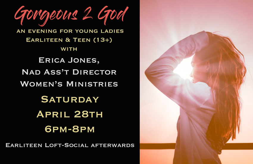 Erica Jones, the NAD assistant Women's Ministries director, is coming to the PMC Earliteen Loft to speak exclusively to our young ladies age 13 and above! This event takes place Saturday, April 28, from 6–8 p.m. followed by a social/game Night. Light refreshments will be served. Encourage your daughters, nieces and granddaughters. Music by #Blessed. Do not miss this event. Sponsored by the Pioneer Memorial Church Earliteen Sabbath School.
