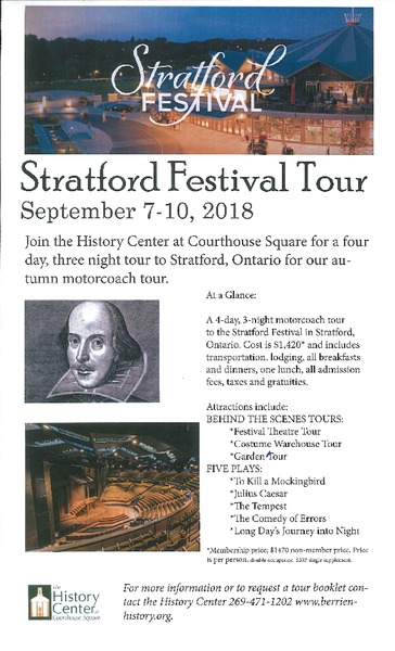 A 4-day, 3-night motorcoach tour to the Stratford Festival in Stratford, Ontario. Cost is $1,420* and includes transportation, lodging, all breakfasts and dinners, one lunch, all admission fees, taxes and gratuities.