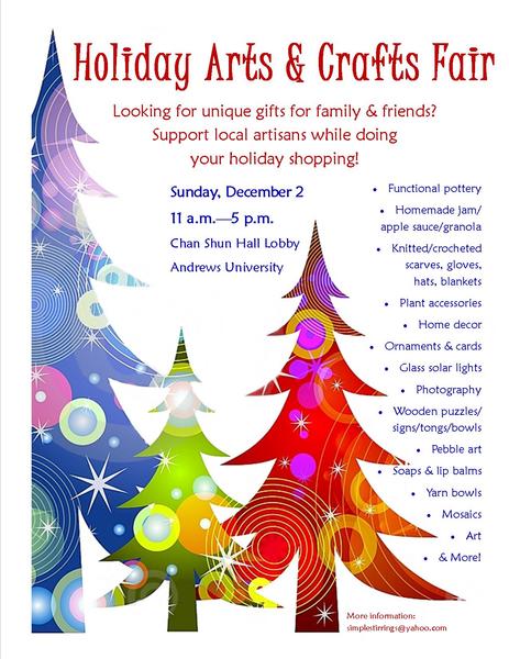 Join us for the 5th Annual Holiday Arts & Crafts Fair! This event exists primarily to provide a venue at which Adventist artisans can showcase their creations. Hundreds of beautifully handcrafted items will be for sale by over 20 vendors.