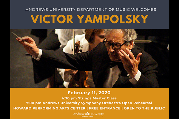 The Andrews University Department of Music will welcome conductor Maestro Victor Yampolsky to campus on Tuesday, Feb. 11, 2020. Maestro Yampolsky will lead a master class for the Department of Music’s string musicians, then shortly after will direct an open rehearsal with the Andrews University Symphony Orchestra. While working with the orchestra during open rehearsal at the Howard Performing Arts Center from 7–9 p.m., Maestro Yampolsky will be amplified. All members of the public are invited to attend and listen.