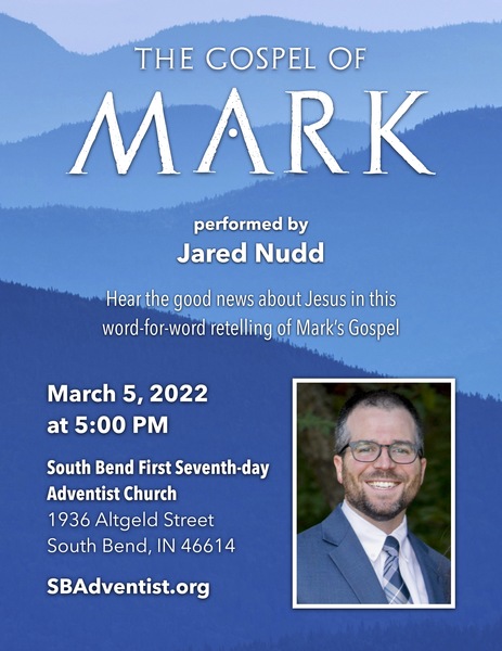 Jared Nudd presents an exciting word-for-word retelling of Mark's Gospel on Saturday, March 5, at 5 p.m. Come and hear the good news about Jesus as if it were being told for the first time. "Whoever has ears to hear, let them hear!"