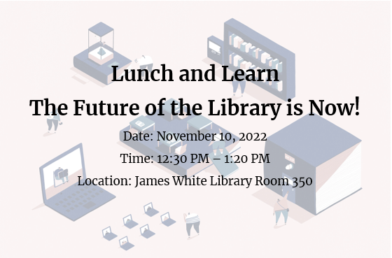The James White Library librarians will present on three important challenges facing academic libraries, including library spaces, library collections and the profession. Faculty and librarians will also share opportunities for collaboration to advance scholarship and student success.