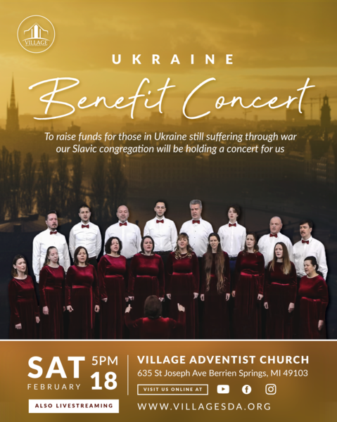 The Slavic congregation at the Village Seventh-day Adventist Church will be sharing a 60-minute concert to benefit those in Ukraine who are working to relieve suffering and bring hope. A freewill offering will be taken.