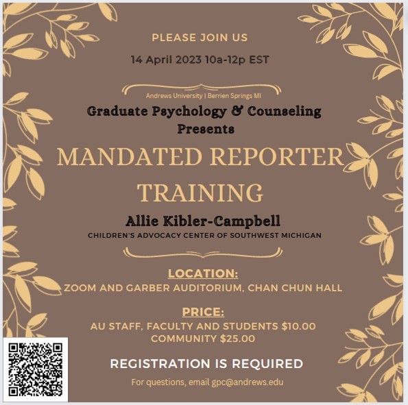 The Department of Graduate Psychology & Counseling invites you to participate in "Mandated Reporter Training":