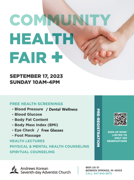 Andrews Korean SDA Church is hosting a health fair for the community. There will be free health screenings, consultations with health professionals, New Start health lectures, and foot massages. Students and neighbors who do not have access to medical care are welcome to participate. Reservations are limited to only 100 people so register today.