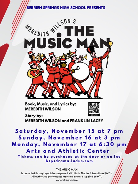 Berrien Springs High School will perform Meredith Willson's "The Music Man" on Saturday, Nov. 15, at 7 p.m.; Sunday, Nov. 16, at 3 p.m.; and Monday, Nov. 17, at 6:30 p.m. Tickets can be purchased at the door or online at bspsdrama.ludus.com.