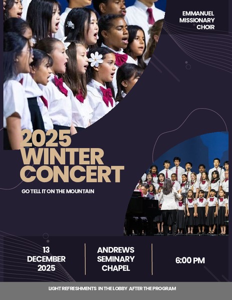 The Emmanuel Missionary Choir warmly invites the community to join them for an evening of music as they present their Winter Concert under the theme, “Go Tell It On The Mountain.” The concert will take place on Saturday, Dec. 13, at 6 p.m. in the Andrews University Seminary Chapel. Refreshments will be served in the lobby after the concert.