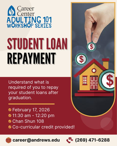 Wondering what happens after graduation? Representatives from AU Student Financial Services will guide you through loan repayment options, timelines, and strategies to help you manage your student debt with confidence. This session will be presented on Tuesday, February 17, 2026 from 11:30 am – 12:20 pm in Chan Shun Hall, Room 108. It is open to all majors including graduate students. Co-curricular credit will be provided. A hybrid option is available for distance learning students only by contacting career@andrews.edu.