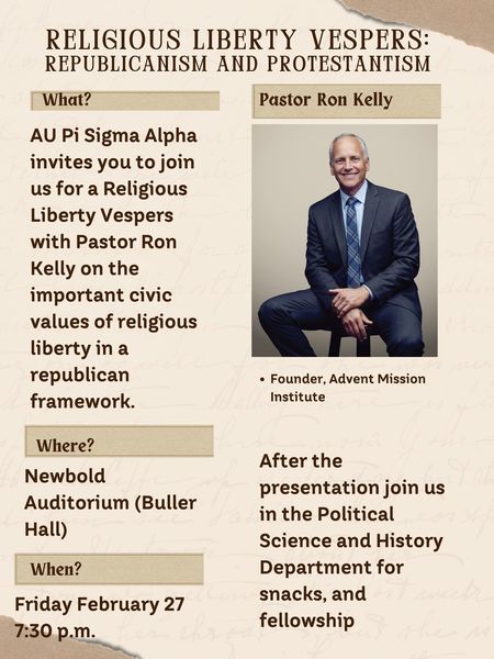 Andrews Pi Sigma Alpha Chapter is hosting a religious liberty vespers headlined by Pastor Ron Kelly. Talking about Mrs. White’s views on republicanism and Protestantism.