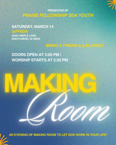 Praise Fellowship Seventh-day Adventist Church invites you to an AY service on Saturday evening, March 14, 2026. We look forward to seeing you then! Have a blessed week!