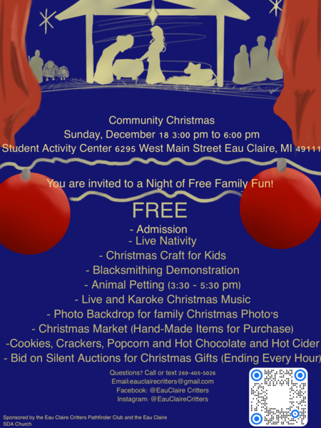 Celebrate Community Christmas—Come experience a celebration of Christ's birth from 3–6 p.m. on Sunday, Dec. 18, at the Student Activity Center in downtown Eau Claire located at 6295 West Main Street, Eau Claire, MI. The event also features... read more