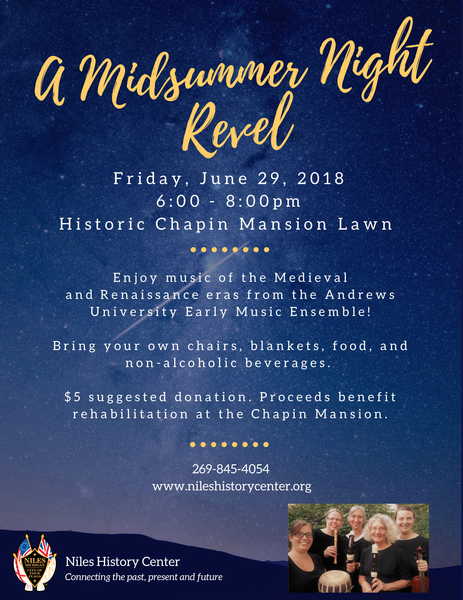 The Andrews University Early Music Ensemble, in collaboration with the Niles History Center, presents a program of Medieval and Renaissance music celebrating the summer season appropriate for the whole family! ...