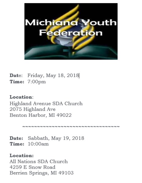 Please join us as the Michiana Youth Federation will have vespers in Benton Harbor and a unique Sabbath School and worship experience in Berrien Springs.