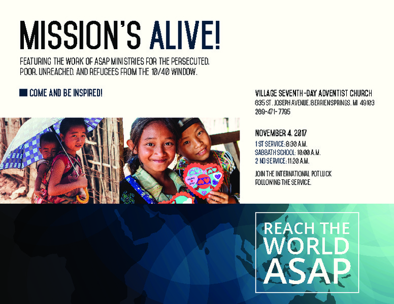 ASAP Ministries will present "Mission's Alive!" on Saturday, Nov. 4, at the Village Seventh-day Adventist Church. "Mission's Alive!" will feature the work of ASAP Ministries for the persecuted, poor, unreached and refugees from the 10/40 Window. ... read more