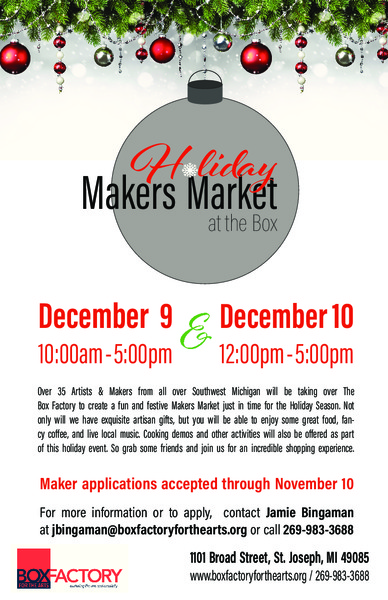 St. Joseph, Michigan (October 27, 2017)—Artists & Makers will be setting up booth spaces throughout The Box Factory to create a fun and festive Makers Market just in time for the Holiday Season. Not only will exquisite artisan... read more