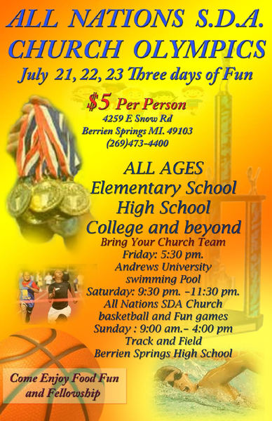 Friday 5:30 pm @ Andrews University Swimming Pool Saturday 9:30 pm - 11:30 pm @ All Nations SDA Church basketball and fun games Sunday...