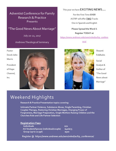 The 2017 ACFRP Conference titled "The Good News About Marriage" with keynote speakers Shaunti Feldhahn and Derek Morris, will take place July 20-22, 2017 at the Seminary. Research reveals... read moreUpcoming Events