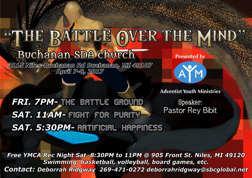 Buchanan Seventh-day Adventist Church 3115 Niles Buchanan Rd Buchanan, MI 49107 Sabbath School: Saturday 9:30 a.m. Worship Service: Saturday 11 a.m. Prayer Meeting: Wednesday, 7 p.m.... read moreChikaming SDA Church Service: Apr. 1