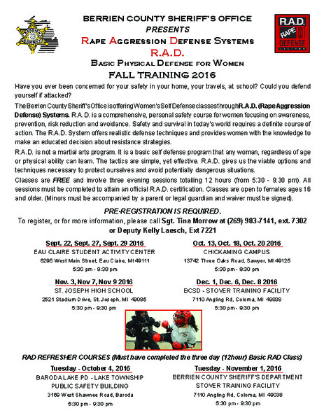 The Berrien County Sheriff's Office is offering women's self defense classes through R.A.D. (Rape Aggression Defense) Systems. This is not martial arts, it is a basic self-defense program that any woman, regardless of age or physical ability, can...