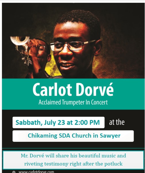Chikaming Seventh-day Adventist Church 13083 Red Arrow Hwy Sawyer, MI 49125 Join us this Saturday afternoon, July 23 at 2 p.m. for a concert with acclaimed trumpeter, Carlot Devoré. ... read moreConcert with Acclaimed Trumpeter Carlot Devore