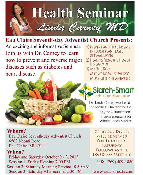 Health Seminar with Dr. Linda Carney, M.D. at the Eau Claire SDA Church, 6562 Naomi Road, Eau Claire -- Friday, Oct 2, 7 p.m., Sabbath, Oct 3 10:50 a.m. and... read more