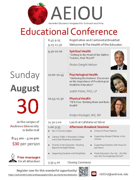 The AEIOU Educational Conference will be hosted at Andrews University on Sunday, Aug. 30, from 8:30 a.m.-4:00 p.m. Guest presenters include Dwight Nelson, Judith Fisher and Evelyn Kissinger. Registration is required and there is a $30 fee. ... read more