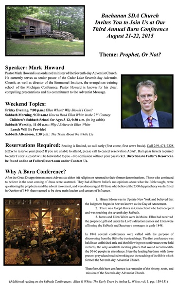 All are welcome to Buchanan SDA Church's Third Annual Barn Conference. Pastor Mark Howard is the featured speaker. For full details, see the attached flyer.