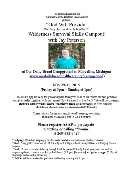 The Hartford Skill Co-op (a ministry of the Hartford SDA Church) presents: "God Will Provide! Building Skills and Faith Together" - a wilderness survival skills campout with Jay Peterson at Our Daily Bread Campground in Marcellus, Michigan. ... read moreNiles Westside for May 23