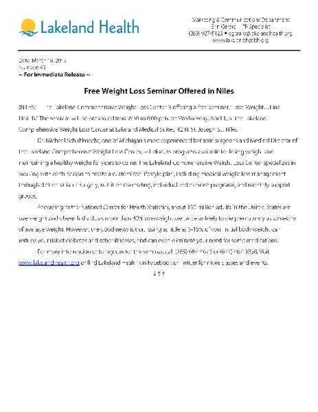 Free Weight Loss Seminar Offered in Niles (NILES) –  The Lakeland Comprehensive Weight Loss Centeris offering a free seminar, “Lose Weight…Find Health.” The seminar will be presented from 6:30 to 8:00... read more
