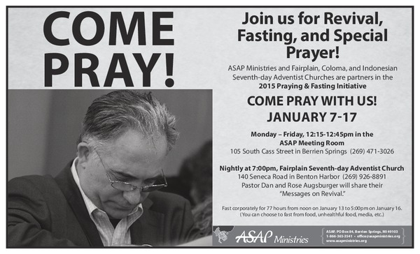 Join us for Revival, Fasting, and Special Prayer ASAP Ministries and the Fairplain, Coloma and Indonesian Seventh-day Adventist Churches are partners in the 2015 Praying & Fasting Initiative, January 7–17.  ... read more