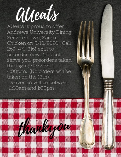 AU Eats Menu for May 4–8, 2020. To place your order, please call 269-471-3161, option 1, between the hours of 8 a.m. and 10 a.m., Monday–Friday.