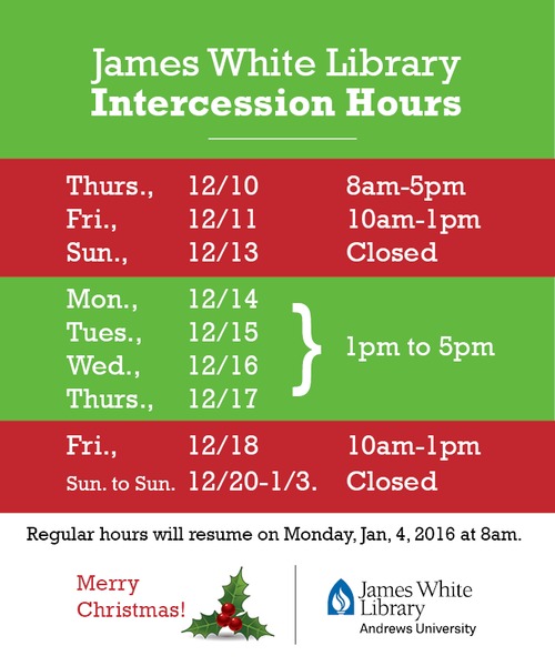 James White Library Christmas Break hours. We wish you all a Merry Christmas and a Happy New Year.