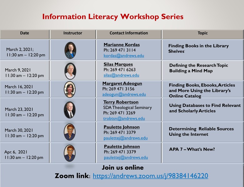 Join us on Tuesday, March 23, for a James White Library Information Literacy Workshop to be presented by Terry Robertson, Associate Dean of Libraries/Seminary Librarian/Digital Commons Librarian, on "Using Databases to Find Relevant and Scholarly Articles." ...