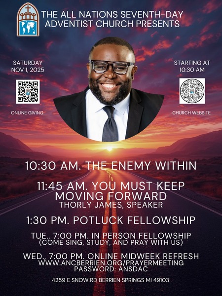 Join us for our worship experience at the All Nations SDA Church this Saturday, November 1, at 11:45 am, as Thorly James presents "You Must Keep Moving Forward." Adult and Children's Sabbath School begins at 10:30 am. Lunch... read more