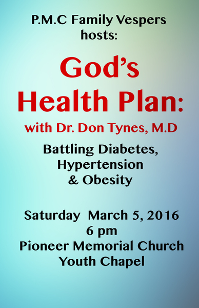 Dr. Don Tynes will present God's Health Plan, and discuss causes and remedies for diabetes, hypertension, and obesity.